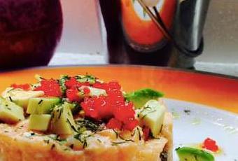 Con el aguacate sobrante cortamos pequeños trocitos que colocamos sobre el tartar y alrededor del pastel.