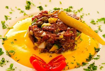 Para prepara el tartar, picar la carne en dados pequeños con un cuchillo bien afilado, poner en un bol y aderezar con la salsa de soja, el aceite de oliva, la sal, la pimienta, añadir una de las guindillas troceada, las alcaparras, la mostaza y el aguacate picados. Guardar durante unas dos horas en el frigorífico para que se mezclen los sabores.