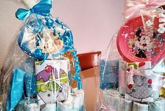 Las tartas, están compuestas por: 33 pañales dodot, Champú Jonhson, esponja de baño, toallitas de bebé, babero, y platito Disney para sus primeras papillas. (Mickey para el niño y Minnie para la niña). Precio 20€