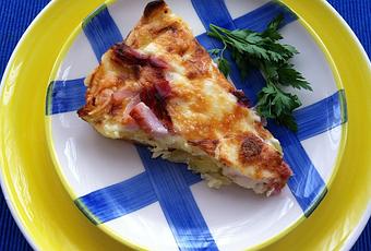 Se cortan las patatas en rodajas y se disponen en la base de la tarta. Se coloca encima el bacon o el pavo (si es pavo cocido en fiambre no hace falta cocinarlo). Se corta el queso en dados y se espolvorea por encima.