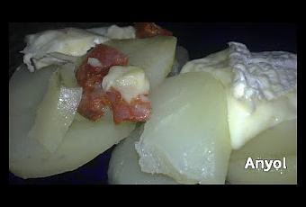 Las patatas han salido jugosas de verdad, normalmente se hace con tiras de tocino o de bacon y con Reblochon (queso que se derrite sobre las patatas y es un gustazo comerselo). Yo uso chorizo, por aquello de "a lo español" y por que nos gusta mas. Y el queso por aqui no lo he encontrado, asi que he usado un camembert, aunque no se derrite tanto y queda mas entero.