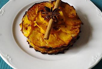 Poner en un cazo el agua y el azúcar, calentarlo y cuando el azúcar se haya disuelto, retirarlo del fuego.Cortar cuatro discos de masa de hojaldre y disponer las láminas de melocotón encima superponiéndolas y formando varias capas, pincelarlas con el licor de anís y espolvorearlas con la canela.