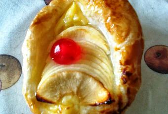 2. Precalentar el horno a 250 ºC Colocar la lámina de hojaldre sobre la bandeja de horno, con papel sulfurizado. Añadir la crema pastelera. Cortar la manzana en láminas y disponer sobre la crema, cubriéndola más o menos, al