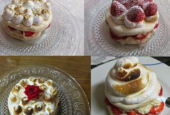 Tapamos con otro circulo de merengue, ponemos unas bolas de merengue y un fresón encima, espolvoreamos con azúcar glass.