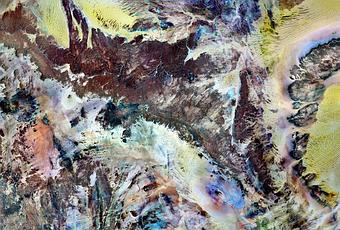 Esta imagen, que parece una acuarela abstracta, fue realizada en el año 2000 a partir de numerosas observaciones del satélite Landsat 7 con una combinación de luz infrarroja, infrarrojo cercano y visible que permiten distinguir los diferentes tipos de materiales. La arena aparece en tonos amarillo y marrón, las rocas de granito de color rojo ladrillo y las áreas azules son probablemente sales. Foto: NASA Image of the Day. Clic para ampliar.