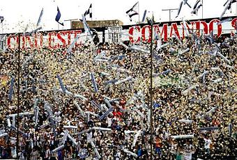 Una vez que ellos empezaron a entonar sus himnos, sus canciones, sus estribillos, Alejandro venció su timidez y se les acercó. Hizo un esfuerzo por aprenderse los cantos y empezó a corearlos como si fuera uno más. Nadie reparó demasiado en su presencia - salvo un par de sonrisas amistosas de los que él consideraba más grandes - pues ellos estaban concentrados en cantar y en que las botellas de licor que circulaban volvieran a sus manos. Y así, en medio de la energía de ese grupo, de su emoción por cantarle a su equipo, del ambiente a alcohol y el olor a humo con aromas extraños, Alejandro vio por primera vez salir a Alianza Lima a un campo de juego.