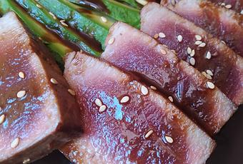 Los jugos que han quedado en la sartén echarlos en la cacerola donde se ha reducido el marinado y mezclar bien de forma que se integren todos los ingredientes.. Cortar los trozos de atún en lonchas de menos de un dedo de grosor, servirlas en el plato y echar por encima la salsa reducida, procurando que esté caliente adornando con sésamo.