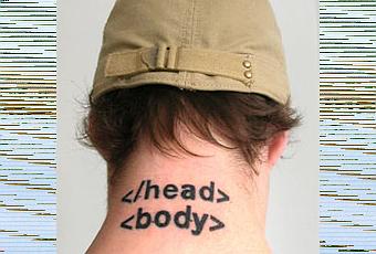Hay tatuajes raros, pero éste es muy ingenioso. Debajo de la imagen está la explicación para los que no sean geeks al 100%. Todas las páginas web tienen en su código fuente HTML el encabezado delimitado por las etiquetas <head></head> y el cuerpo de la página delimitado por las etiquetas <body></body>.