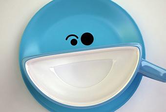 Suponemos que de lado, la apariencia de la taza sonriente Smile Cup también debe ser curiosa, pues la taza que hace las funciones de boca está partida por la mitad. Aunque es cierto que, por tanto, en ella sólo cabe la mitad de contenido que en un tazón normal, también tiene sus ventajas, porque al ocupar la mitad del espacio, el plato que la acompaña puede albergar más cantidad de alimentos, como galletas o tostadas, convirtiéndose así en una mini-bandeja.