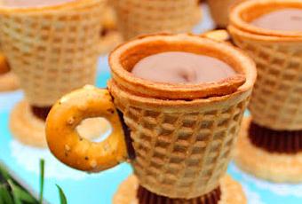 4. Una vez frío, rellena el cucurucho de lo que más te guste y con el mismo sistema, utilizando el chocolate caliente como pegamento, colócale media galletita al cucurucho a modo de asa.