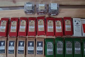 8 variedades de Rooibos: Natural, con Cacao y Avellanas, con Frutas Rojas, con Cacao y Frambuesas, con Canela y Naranja, con Melocotón y Albaricoque, con Vainilla y con Fresa y Vainilla