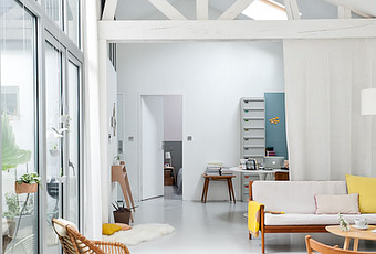 Vista del salón en blanco de su casa con ventanales a un patio y al fondo su estudio