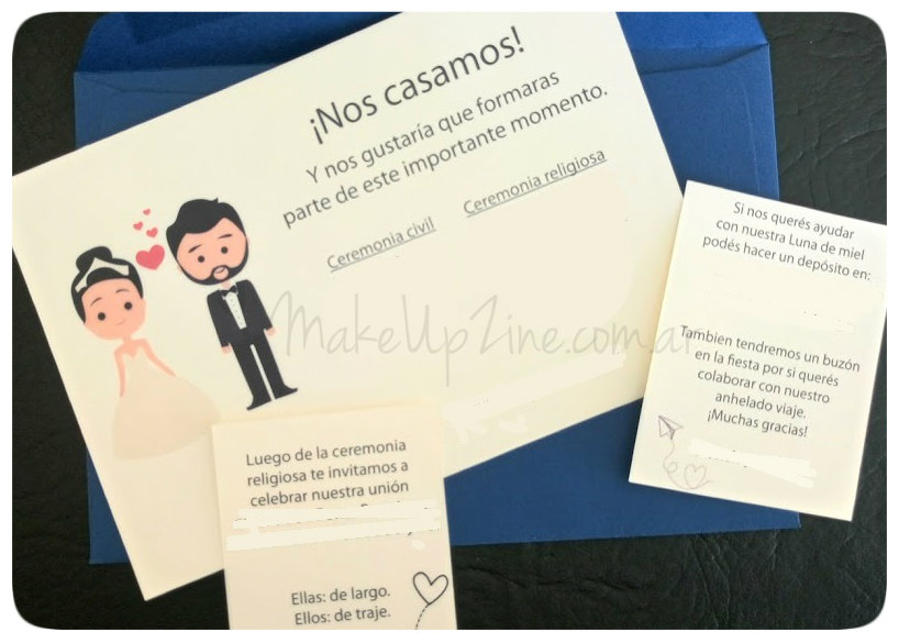 Arranquemos por el principio: mi casamiento fue en otoño, de noche y me casé por Civil y por Iglesia (un miércoles y un sábado respectivamente). Hicimos la fiesta en un lugar bajo techo por miedo a las bajas temperaturas (y menos mal que así lo hicimos porque hizo frío y hubo 98% de humedad, aunque estuve tan nerviosa que no me dí ni cuenta!). Casi todo lo hicimos a puro pulmón y con mucho cariño porque queríamos que la boda tuviera ese sello personal que le das a las cosas cuando las hacés con amor. Así que desde las tarjetas hasta el adorno de la torta, todo pasó por nuestra cuenta, lo que conlleva mucho cansancio y esfuerzo, pero valió la pena al mil por ciento. Elegimos hacer unas tarjetas informales y después de pasar algunas horas con Corel, salió esto. Las imprimimos en lo de un amigo que tiene impresora láser y elegimos los sobres en una librería. Quisimos ambientar todo en colores crudos y azul marino, así que las tarjetas ya salieron con esos tonos.