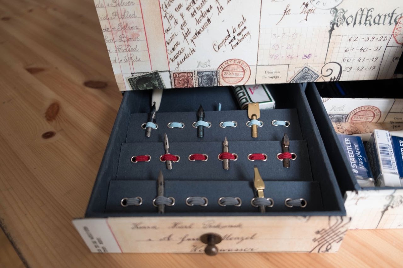 Y por último los diferentes cajones, para plumillas, gomas, tinteros, los palilleros, etc.