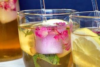 - Previamente preparar los cubitos de hielo. Se pueden hacer con agua o con té. Está vez los hice con agua y deposite en cada cubito unas hojas de hierbabuena, pétalos de rosa o trocitos de limón.