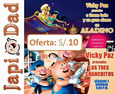 Oferta: ¡Imprime este vale y pagarás en Boletería del Teatro sólo S/.10 por entrada!Edad infantil recomendable: Desde 2 añosPrecio: Adultos S/.25. Niños S/.20Días: Sábados y Domingos a las 4:00 pm (Aladino) y 5:00 pm (Los 3 Chanchitos)Lugar: Jazz Zone, La Paz 656. Miraflores.