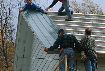Colocación de planchas de metal sobre un techo viejo de casa americana