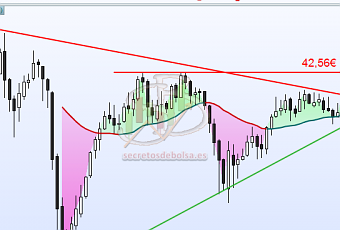 El siguiente obstáculo al que se enfrentó el precio ha sido la resistencia correspondiente a los 42,56€ como podemos ver en gráfico semanal y que atravesó a finales del mes pasado. Seguidamente realizó una aproximación a dicha resistencia que ahora hace las veces de soporte realizando lo que parecía un pulback.