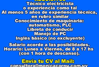 INSCRIPCIONES:Para postularte, envía tu CV al Mail: [email protected] en el asunto el rol al que aplicas.Asunto:Técnico ElectricistaInscripciones hasta el 28/11/2025 MÁS EMPLEOS VIGENTES CLICK AQUÍhttps://empleosvigentesbolsatrabajouruguay.blogspot.com