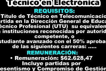 Requisitos Solicitados:EXCLUYENTESFormación:• Título de Técnico en Telecomunicaciones, impartida en la Dirección General de Educación Técnico Profesional (UTU) o su equivalente en instituciones reconocidas por autoridad competente, oEstudiante avanzado con el 50% aprobado de las siguientes carreras:• Ingeniería eléctrica perfil electrónica y/o telecomunicaciones impartidas por la UDELAR o equivalente en instituciones reconocidas por la autoridad competente.• O Ingeniería en Sistemas de Comunicación impartida por la Universidad de la República, o su equivalente en instituciones reconocidas por autoridad competente.• O Ingeniería en Electrónica o en Telecomunicaciones impartido por instituciones reconocidas por autoridad competente.• O Ingeniero/a Tecnológico/a en Electrónica (Opción Telecomunicaciones),impartida por la Dirección General de Educación Técnico Profesional (UTU) o su equivalente en instituciones reconocidas por autoridad competente.