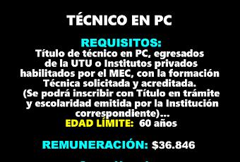 Requisitos Excluyentes:A. FORMACION:Título de técnico en PC, egresados de la UTU o Institutos privadoshabilitados por el MEC, con la formación Técnica solicitada y acreditada. (Se podrá inscribir con Título en trámite y escolaridad emitida por la Institución correspondiente).A VALORARCursos en directa relación al cargo a cubrir (con duración mayor a 3 meses)B-EXPERIENCIA: Acreditar experiencia mayor a un año en directa relación al cargo a cubrir