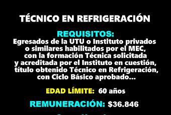 Requisitos Excluyentes:A. FORMACION:Egresados de la UTU o Instituto privados o similares habilitados por el MEC, con la formación Técnica solicitada y acreditada por el Instituto en cuestión, título obtenido Técnico en Refrigeración, con Ciclo Básico aprobadoA VALORARA. FORMACION: Cursos en Refrigeración y Aire acondicionadoB. EXPERIENCIA: 1 año mínimo en ámbito público o privado en tareas similares debidamente documentado en sistema centralizados.COMPETENCIAS CONDUCTURALES Y/O FUNCIONALES- Trabajo en equipo- Respeto de la jerarquía- Planificación y organización