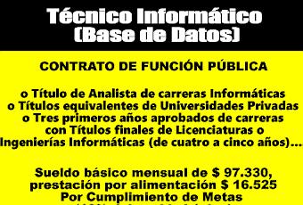 Lea con Atención !!Al Final de la Publicación Está el Acceso al Registro...Brindamos la Información Como nos Gusta Recibirla...Inscripciones 27/11/2023 hasta el 11/12/202Objetivo de la ocupaciónRealizar tareas en las unidades dependientes de la Coordinación de Servicios Informáticos,vinculadas a Administración y Soporte de Infraestructura de Tecnología Informática con orientación en Administración de Base de Datos.