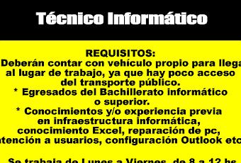 Lea con Atención !!Al Final de la Publicación Está el Acceso al Registro...Brindamos la Información Como nos Gusta Recibirla...Inscripciones hasta el 15/12/2023Algunas de las tareas a realizar son: • Mantenimiento del sistema informático total de la organización (software). • Solución a los distintos problemas que surjan, con inclusión de los requerimientos de los usuarios internos. • Capacitar y dar apoyo a usuarios con déficit de formación para interactuar con computadoras. • Mantenimiento del entorno de las computadoras (alimentación, sistema de red, cables, etc.). • Mejoramiento de hardware (PCS y otros) y red. • Detección y Prevención de posibles problemas informáticos. • Seguimientos de sistemas críticos, como ser antivirus, cámaras, sistema de respaldo: de información, equipos de respaldo.