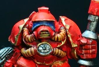 Este tecnosacerdate Squat del Adeptus Mechanicus está equipado con una pistola laser en su mano derecha y con un hacha de energía en su mano izquierda y con una servoarmadura