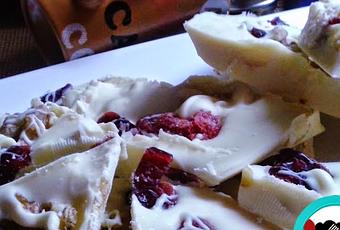 2.- Cortamos el chocolate a cuadros, los ponemos en el recipiente y dejamos que se derrita a fuego medio. Removemos con una cuchara de espátula. Retiramos del fuego y dejamos que el calor termine de derretir el chocolate.3.- Forramos una fuente con papel de horno. Extendemos el chocolate sobre él. Picamos los frutos y los esparcimos por encima. Salpicamos los frutos con un poco de chocolate. Dejamos enfriar en lugar seco y fresco 4 horas. O dejamos enfriar en la nevera hasta solidificar.