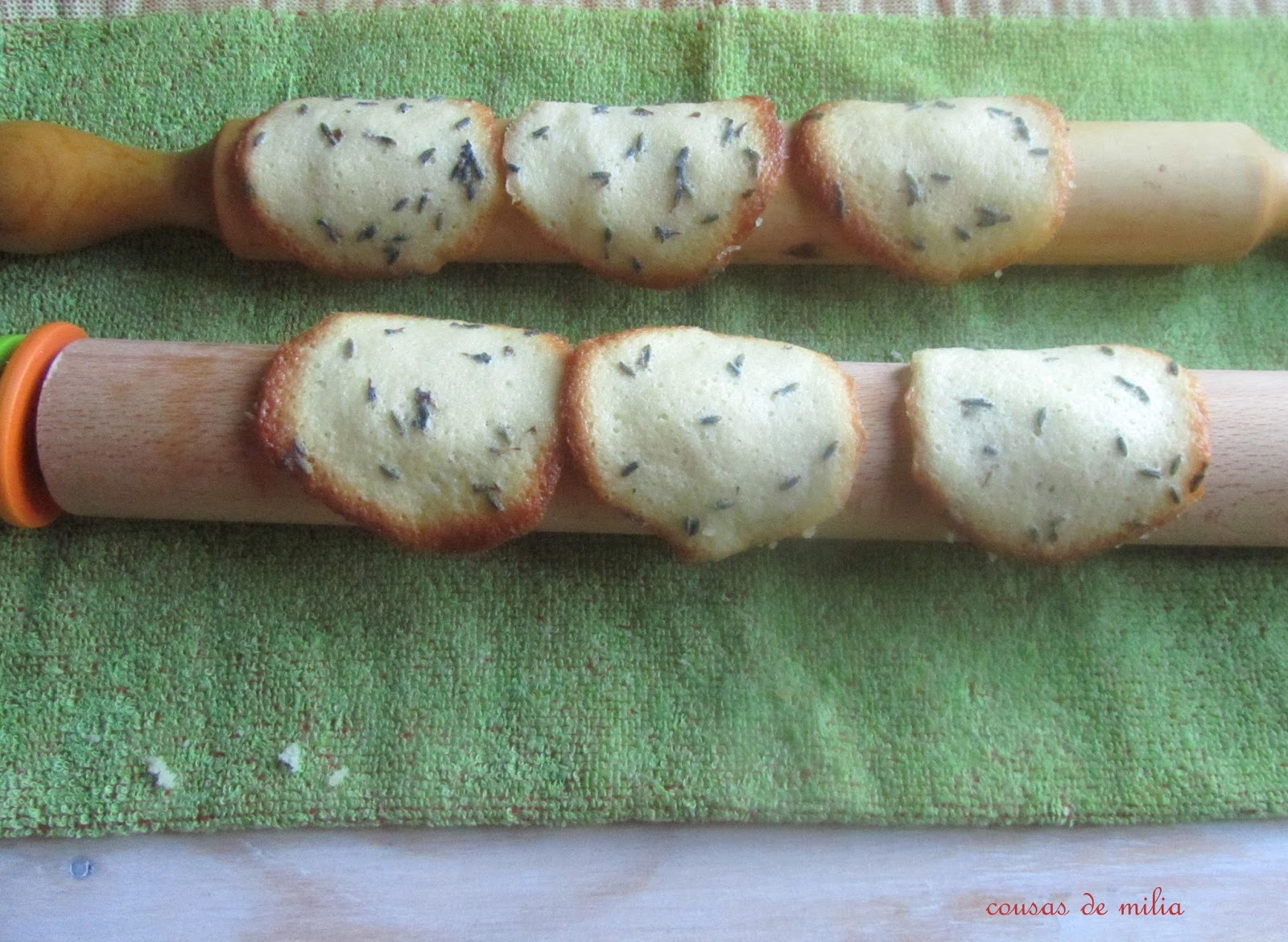 Cubrir una bandeja de horno con papel de hornear o preparar un silpatBatir la clara de huevo, el azúcar y la vainilla en un tazón hasta que esté blanco y espumoso. Agregar la harina y la mantequilla, se remueve hasta que se forma una mezcla suave. Dejar reposar durante 15 minutos.
