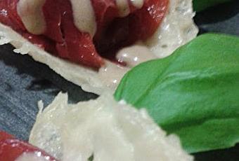 Forramos una bandeja de horno con papel vegetal y ponemos sobre ella cuatro montoncitos de queso en forma de bolita. Los metemos en el horno a 200º y cuando veamos que el queso empieza a fundirse, abrimos el horno y le damos forma redonda con ayuda de una cuchara. Volvemos a cerrar el horno y esperamos unos cinco minutos, hasta que el queso empiece a dorarse. Pasado este tiempo, sacamos del horno y con cuidado, ponemos las tejas a enfriar sobre algo con forma redonda para darle la forma de teja, yo usé el rodillo de cocina, pero podéis usar también una botella. Una vez frías y con la forma deseada, las colocamos en el plato donde las vayamos a servir, encima ponemos una loncha de carpaccio regada con la salsa que elaboraremos mezclando todos los ingredientes en un bol y batiendo con unas varillas hasta que estén bien emulsionados. Servimos decorando con hojas de albahaca fresca (opcional).