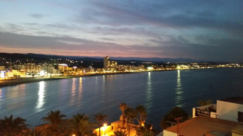 El lugar de mis cortas vacaciones —siempre son demasiado cortas, al menos para los que las vivimos tan intensamente como lo hago yo— está protegido por un mar en calma que disfruta acariciando, como si de las curvas de una…guitarra…se tratase, una preciosa bahía de aguas turquesas y fondos sobre los que caminar es un placer añadido. Una bahía maravillosa de día y sugerente de noche.