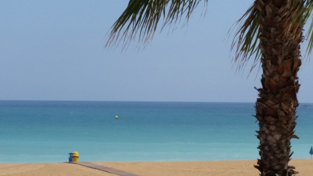La verdad es que no hay mucho que hacer por allí a parte de disfrutar del Sol, de la arena despegada y de la espuma que refresca nuestra piel bronceada. El ambiente es familiar, pensado para el disfrute de todos aquellos cuyas opiniones, generalmente, no tenemos en cuenta y nos importan bien poco a la hora de hacer nuestros planes vacacionales. Para estos bajitos a los que me refiero se sucedían, por doquier, multitud de actividades. Que la vocación del lugar fuese el enfoque familiar con los pequeños tenía, para nosotros, varias ventajas: los precios eran más bajos que los supuestos para un lugar de costa en verano y nos permitieron disfrutar varias veces de un buen menú mediterráneo de cara al mar del mismo nombre; la calma más allá de las doce de la noche era absoluta, lo que permitía descansar y madrugar para hacer deporte junto al mar: en mi caso disfrutaba, días alternos, de la carrera y la marcha nórdica.Os aseguro que en mi lugar gocé de buenos momentos, conmigo y mis pensamientos, disfrutando de la inmensidad del mar que se me presentaba con una visión flanqueada por evocadoras palmeras;