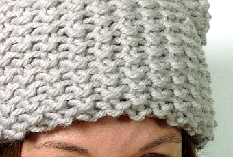 Cuerpo del gorro: Tejer alternando 1 punto derecho – 1 punto revés (esto resultará en punto arroz) hasta tener un largo de unos 35cm. Entonces doblar el tejido sobre él mismo, volver a colocar la primera fila sobre el telar y pasar cada bucle inferior por encima del superior.
