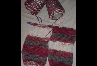un par de conos de MERINO EXTRA multicolor con tonos granates-gris-crudo que he tejido en punto liso derecho-revés para no quitarle protagonismo a los colores, ya que tienen unos contrastes bien definidos: