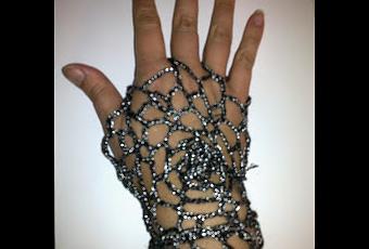Para la noche de Halloween, unos guantes de malla que simulan una telaraña...Están hechos con un hilo mezcla de negro y plateado.