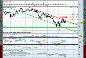 Una vez más, hace algo menos de 2 meses el precio intentó salir del canal bajista atravesando su techo, pero tras tocar los 11,80€, valor que coincide prácticamente con el 50% de Fibonacci, se dio la vuelta y se adentró nuevamente en el canal. Por el momento, los mínimos siguen siendo más altos que los anteriores al igual que los máximos.En cuanto a los soportes tenemos, como podemos ver en la gráfica mensual, tenemos un doble suelo en los 8,70€ con una separación de 3 años y medio, lo que le confiere una gran fuerza.