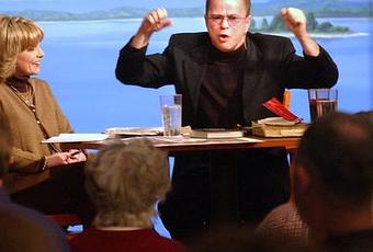 Lori Graham Bakker, izquierda, y su esposo Jim Bakker imparten una lección bíblica durante un estudio bíblico abierto en Studio City Cafe en 2002. (Foto: Christina Dicken / Líder de Noticias)