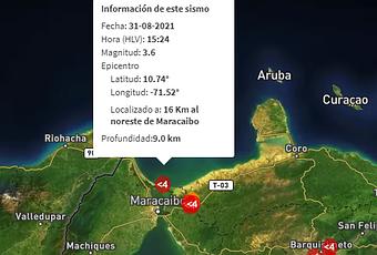 La tarde de este martes 31 de agosto se registró un movimiento telúrico al noroeste de la capital zuliana.