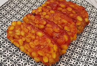 - Cortamos el tempeh en rodajas de medio centímetro de grosor y lo cocinamos a la plancha por ambos lados hasta que se dore un poco. Incorporamos el tempeh en la olla con la salsa y las cubrimos bien con una cuchara.