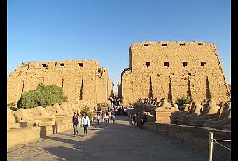 Karnak está dedicado al dios Amón Ra. En el templo se tiene de todo en tamaño XXL, galerías con innumerables estatuas, corredores con esfinges de cabeza de corderos, santuarios, salas y más salas todas llenas de jeroglíficos. Algo que impresiona es la sala de las columnas, son más de 130 de más de 20 metros cada una, con capiteles tipo papiro abierto o cerrado. En los dinteles se observan dibujos con colores originales.Hay numerosas estatuas que si están paradas con un pie al frente representan alguien vivo... en ese entonces. Si tienen los brazos cruzados en el pecho, representan a una persona muerta, le llaman la posición osiríaca pues Osiris era el dios de los muertos. La llave que tienen representada es la llave de la vida.