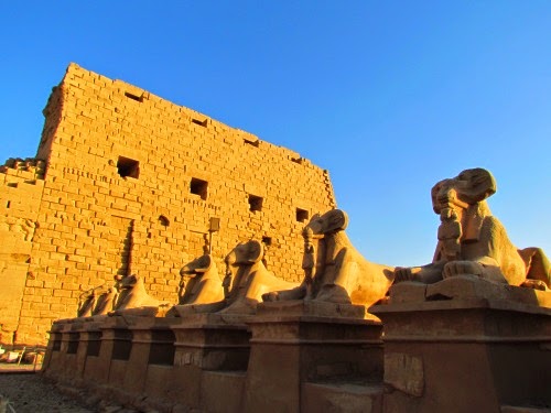 Karnak está dedicado al dios Amón Ra. En el templo se tiene de todo en tamaño XXL, galerías con innumerables estatuas, corredores con esfinges de cabeza de corderos, santuarios, salas y más salas todas llenas de jeroglíficos. Algo que impresiona es la sala de las columnas, son más de 130 de más de 20 metros cada una, con capiteles tipo papiro abierto o cerrado. En los dinteles se observan dibujos con colores originales.