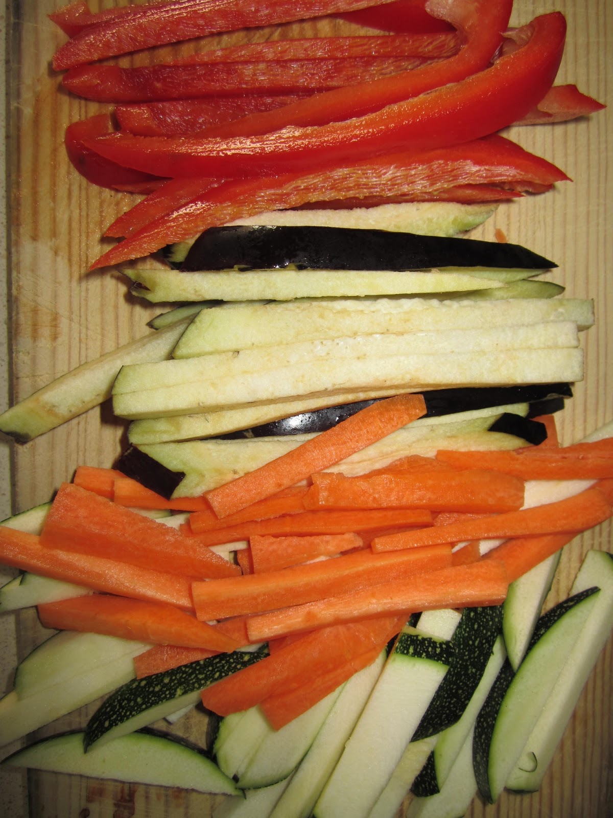 PREPARACIÓN:Con las verduras bien limpitas las cortaremos a bastones, no demasiado finos.