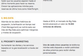 Una tendencia que afecta no sólo al sector turístico, sino a la sociedad en general. El Big Data supone la movilización de grandes cantidades de información y, lo que es más importante, una mejora en nuestra capacidad de análisis. El aumento de estas capacidades va a permitir tener mayores recursos en las tomas de decisiones, no sólo a nivel micro (Yield, Revenue…) sino también macro (inteligencia de mercados). La información se va a convertir cada vez más en materia fundamental de gestión. Lamentablemente creo que a día de hoy no lo es en muchos casos. Y para ello va a ser fundamental mejorar nuestra capacidad de interpretación, análisis y creación. No va a ser mejor el que más información tenga, sino el que mejor la sepa utilizar. Corremos el riesgo de quedarnos en la posesión.
