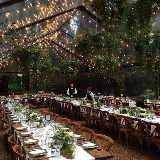 Tanto en bodas al aire libre como en bodas en interior, lo natural es tendencia. Para el exterior, se llevan los espacios con abundancia de árboles y decoración donde el verde es el protagonista. Para interior se busca recrear esta impresión de naturaleza, con vegetación en cascada, jardines verticales, caminos de mesa naturales y jardines colgantes, éste año irrumpen con fuerza, verdes de diferentes tonalidades cayendo desde el techo, el resultado suele ser verdaderamente sorprendente y atractivo.
