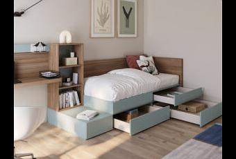 - Camas abatibles con sistema de pistones que permiten levantar la cama sin esfuerzo y convertirla en zona de estudio o juego