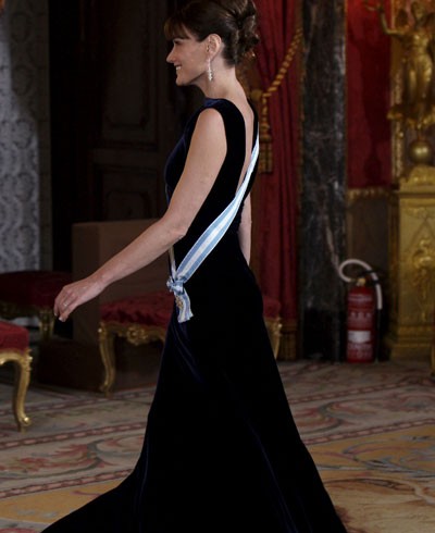 Elegantísima Carla Bruni en su visita a España con un vestido de noche de terciopelo azul