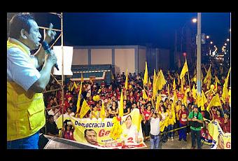 Si bien Goyo Santos, candidato a presidente de la República, está recluido en Piedras Gordas por presunción de delitos contra la administración pública, ello no ha imposibilitado que Democracia Directa esté en campaña – dijeron Jorge Rimarachín y Andrés Alcántara, candidatos a vicepresidentes.Tras resaltar la importancia de una reforma constitucional en el país – se reiteró que ha llegado el momento para que los peruanos voten por la reconstrucción moral, lucha por la seguridad, seriedad en el manejo de gobierno, desarrollo del sistema educativo, descentralización del Estado y equilibrio ecológico.El punto cumbre fue el mensaje que Gregorio Santos, enviara desde la cárcel en Cajamarca, pidiendo unidad a favor de un país más igualitario.“El Perú es nuestra casa, la casa de todos nosotros, jóvenes, adultos, hombres y mujeres tenemos una gran responsabilidad de cambiar nuestra patria” detalló – el popular Goyo Santos desde su encierro.