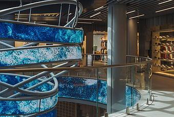 El corazón del espacio lo ocupa una escultura monumental suspendida en el atrio central, que mediante proyecciones digitales envuelve al visitante en una coreografía de luz, color y movimiento evocadora del ecosistema marino. Esta pieza, junto con una estructura cromada que da la bienvenida desde la calle y una línea lumínica en el techo, conforman el sistema de instalaciones digitales que definen el recorrido.